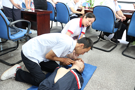本次培訓邀請浙江省紅十字會資深講師團成員李艷主講。李老師以理論與實踐操作相結合的方式,詳細講解了相關突發疾病的相關癥狀、心肺復蘇的理論知識,并現場演示急救操作知識要點。