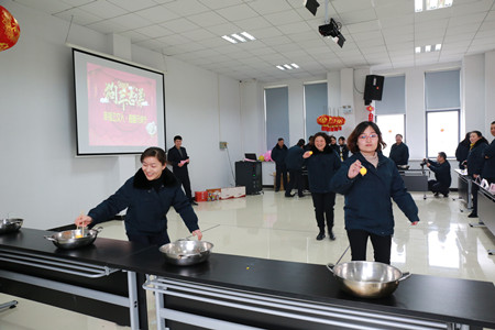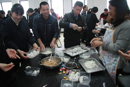 “元宵”慶典活動以“聲聲報福”的踩氣球游戲開場,將現場氣氛推向了第一個小高潮,游戲以一對一踩對方腳邊綁上的氣球形式開展。參賽者各個身懷絕技,互不相讓,圍觀者們也時不時爆發出陣陣歡快的笑聲。隨后是“團團圓圓”“幸福滾滾”等幾輪小游戲。到了傳統節目“猜燈謎”環節,大家的積極性愈發高漲,主持人話筒還來不及遞到跟前,大家就已紛紛搶答,氣氛十分熱鬧。所有小游戲結束后,是主題包元宵活動。大家齊心協力、分工明確,揉面的揉面,拌餡的拌餡,“要裹緊一點,不然一會兒一煮就散了。”前輩們時不時地向“新手”們傳授著經驗,不一會兒,一個個白白圓圓的湯圓就擺滿了桌面,現場一派熱鬧歡騰的景象。